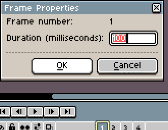 Presionando la tecla ¨P¨ en Aseprite, accedes a las propiedades del frame, como la duración en mili segundos.