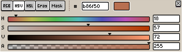 Usaremos el color #b86f50, que es un color con poca saturación lo que da un aspecto antiguo quizas. Y para modificar sus valores, elegimos HSV, el cual yo utilizo y me parece más comodo.