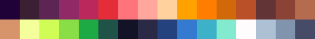 En Pixel Arcane te presentamos una paleta de 32 colores especialmente pensada para artistas de pixel art que buscan equilibrio y contraste. Combina tonos cálidos (rojos, naranjas y marrones) ideales para piel, fuego o materiales orgánicos, con tonos fríos (verdes, azules y grises) perfectos para vegetación, agua o metales.